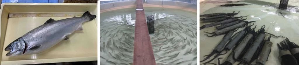 近畿大学水産研究所でも富山実験場においてサケマス類の陸上養殖として、サクラマスの養殖に取り組んでいます。富山県には名産の鱒寿司があります。かつてサクラマスを使って鱒寿司が作られていましたが、現在ではサクラマスがほとんど漁獲されなくなったので輸入された養殖サケマス類が用いられています。富山実験場では水深100m層から取水していて夏でも20℃以下の海水を利用できます。この特徴を利用してサクラマスの陸上養殖研究を進め、富山県内での完全養殖と選抜育種による大型化を目指しています。鱒寿司用として利用可能な魚体重が2.5 kgに達するものも養殖できるようになりました。さらに大型化と周年出荷を目指して全雌三倍体サクラマスの養殖にも取り組んでいます。